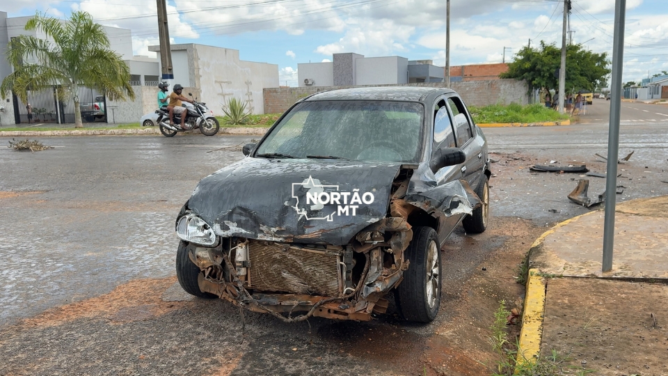 Um acidente de trânsito foi registrado no início da tarde deste domingo (11.01), no cruzamento da Avenida dos Universitários com a Avenida Nilson Buffon, entre os bairros Santa Clara e Rota do Sol, em Sorriso (MT). A colisão envolveu uma caminhonete e um veículo Chevrolet Classic, resultando na queda de um poste de iluminação pública e em prejuízos materiais.
