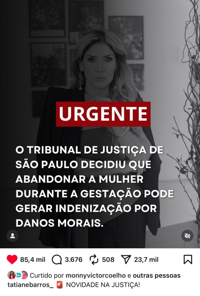 Uma das publicações que ultrapassou 3 milhões de visualizações e 85,4 mil curtidas destacou decisão do Tribunal de Justiça de São Paulo: “abandonar a mulher durante a gestação pode gerar indenização por danos morais”.