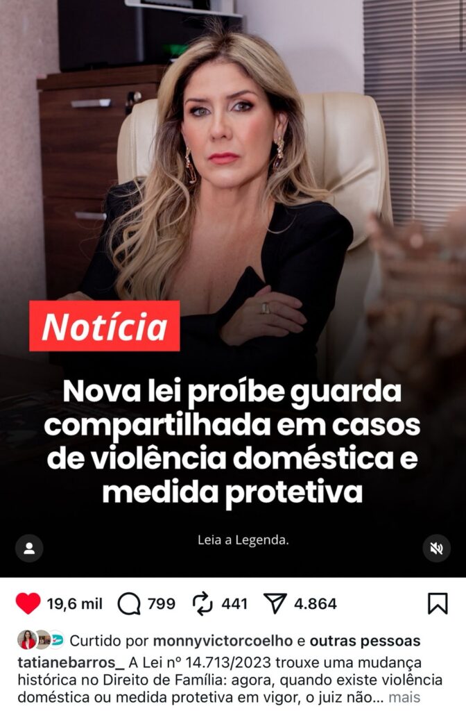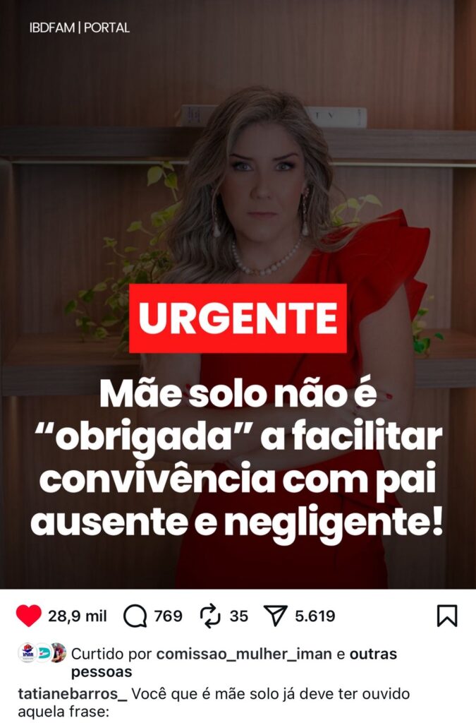 Em outra postagem de grande repercussão e interação do público, a advogada destacou: “mãe solo não é obrigada a facilitar convivência com pai ausente e negligente”. O texto esclarece que pais que não pagam pensão, não demonstram afeto e aparecem de forma esporádica podem ser enquadrados como praticantes de um tipo de violência emocional.