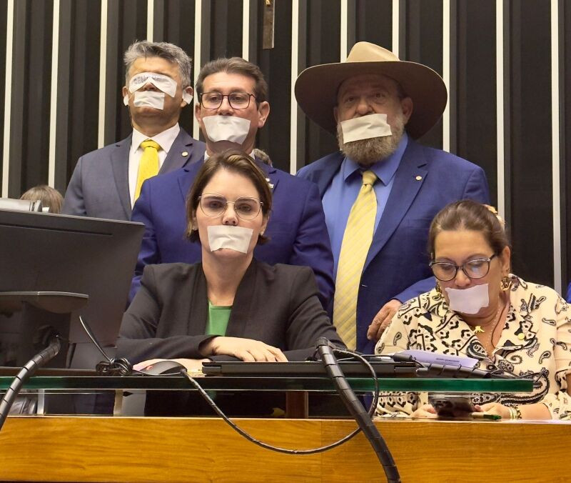 Parlamentares da bancada do PL de Mato Grosso participaram do protesto realizado no plenário da Câmara dos Deputadoscontra a prisão domiciliar do ex-presidente Jair Bolsonaro (PL). Todos apareciam amordaçados e o deputado José Medeiros ainda estava com os olhos vendados.