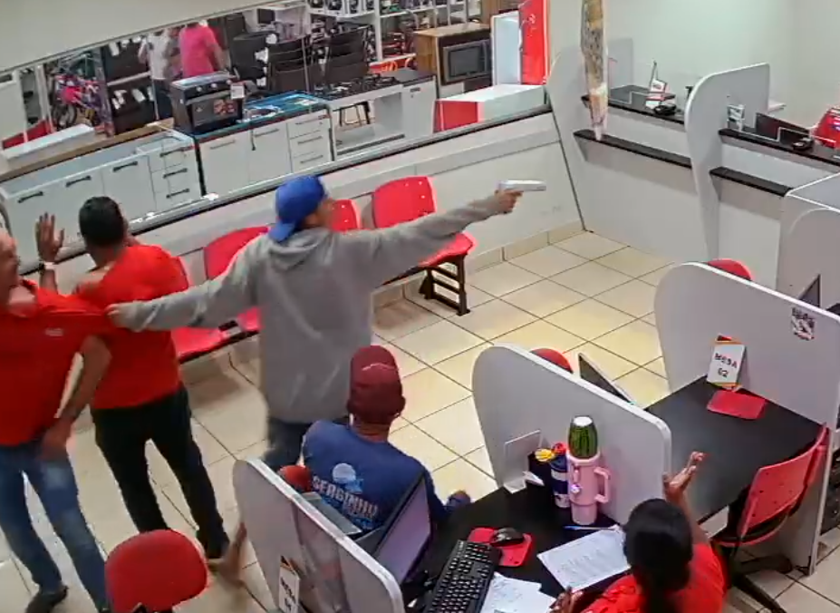 Imagens do circuito de segurança da loja registraram o momento em que a dupla chega, força os funcionários que estavam na calçada a entrar e ficar no mesmo ambiente que os demais. A todo tempo, um dos suspeitos aponta uma arma de fogo contra as vítimas. Em um determinado momento, ele chega a arrastar dois funcionários pela gola de seus uniformes, no intuito de fazer os outros entregarem seus aparelhos celulares e demais pertences pessoais.