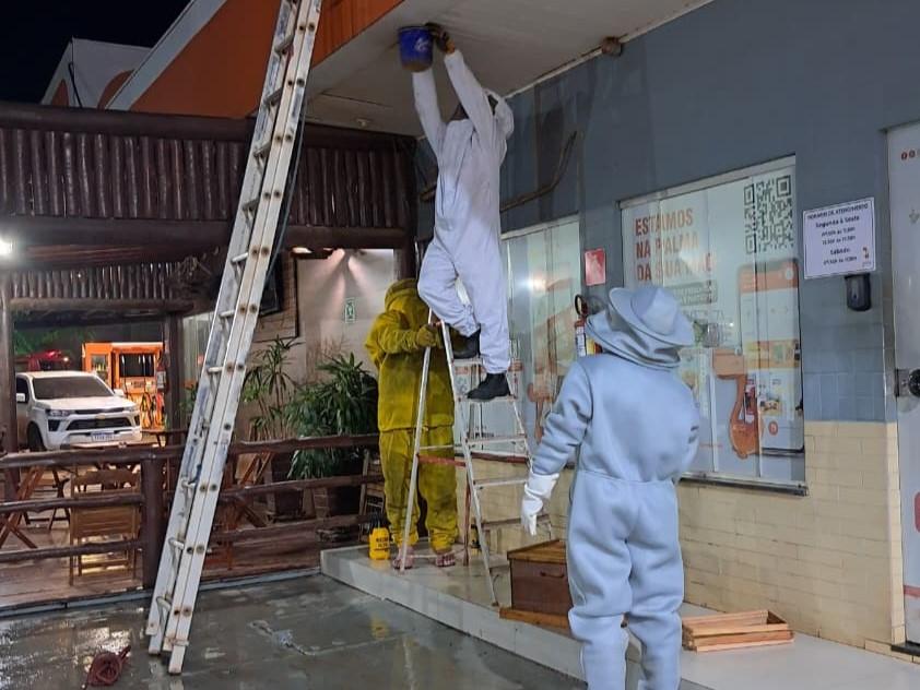 No local, os bombeiros militares constataram a presença de um grande enxame de abelhas. Para realizar a captura, a equipe utilizou técnicas de apicultura, efetuando o manejo manual dos insetos.