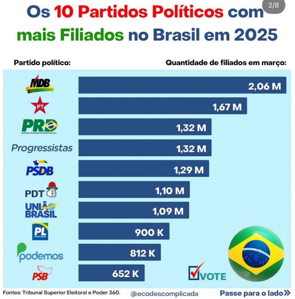 Apesar das críticas crescentes à classe política, o número de brasileiros filiados a partidos segue elevado. Dados do Tribunal Superior Eleitoral (TSE) e do Poder360 indicam que os 10 maiores partidos em número de filiados, em março de 2025, eram: