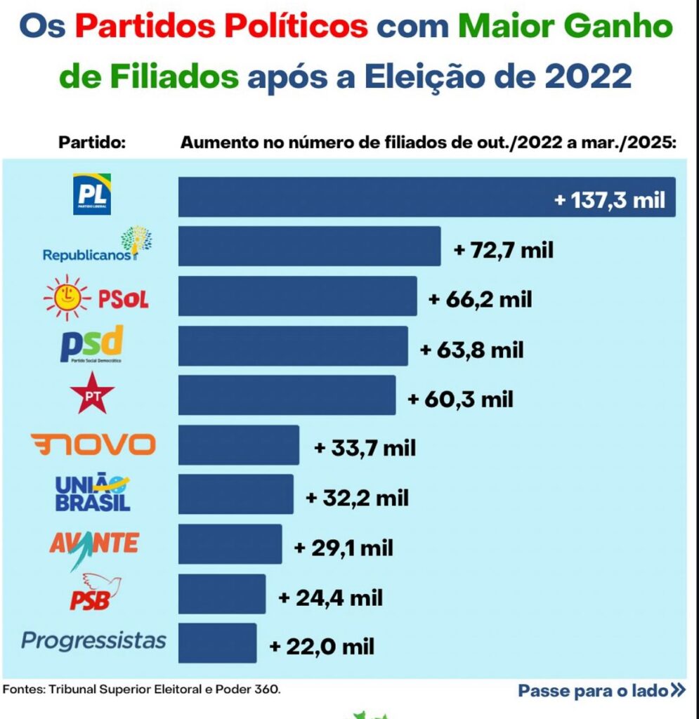 Após a eleição de 2022, os partidos que mais cresceram em número de filiados até março de 2025 foram: