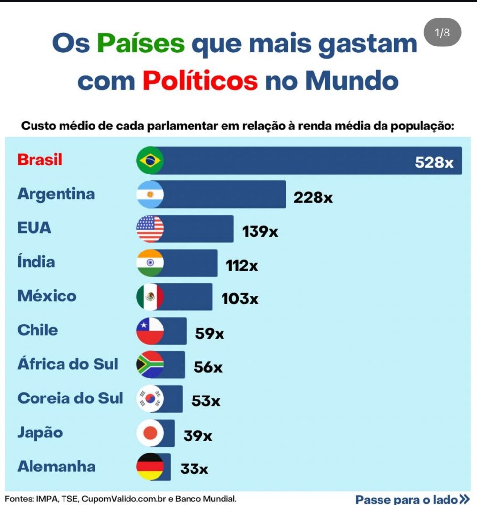 Um estudo conjunto realizado pelo Instituto de Matemática Pura e Aplicada (IMPA), em parceria com universidades como a de Brasília e a do Sul da Califórnia, revelou que o Brasil é o país que mais gasta com políticos no mundo. A pesquisa, que avaliou os custos dos parlamentares em relação à renda média da população, aponta que o custo médio de cada deputado ou senador no Brasil chega a ser 528 vezes maior que a renda média dos cidadãos.