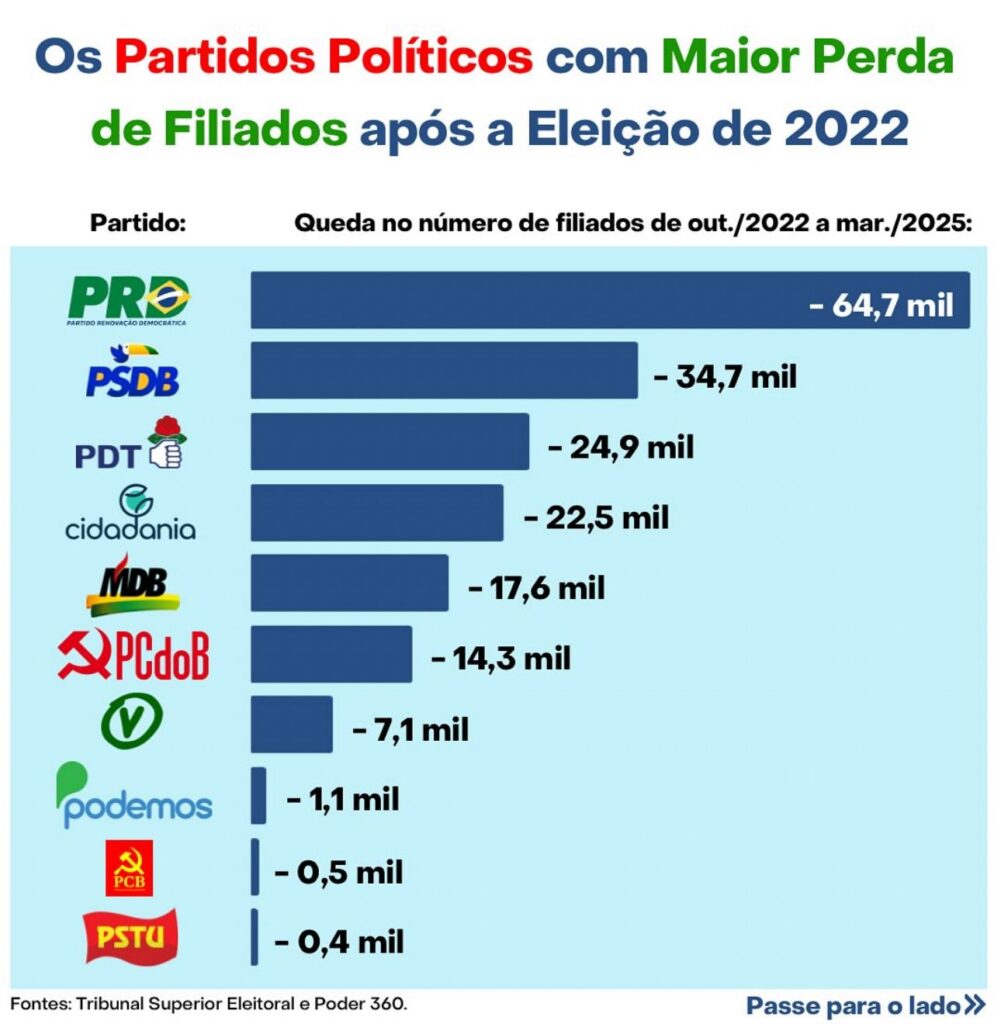 Por outro lado, partidos como o PRD (-64,7 mil), PSDB (-34,7 mil) e PDT (-24,9 mil) lideraram a lista dos que mais perderam filiados no mesmo período.