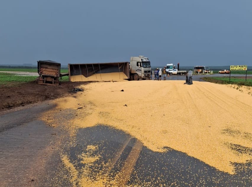 Com o impacto, parte da carga de milho ficou espalhada ao lado da estrada, chamando a atenção de moradores e motoristas que passavam pelo local.