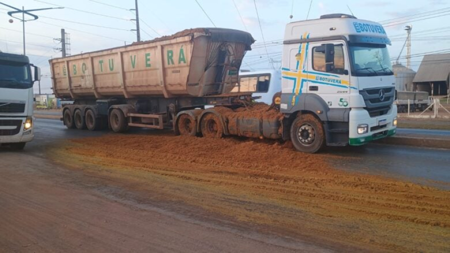 Um caminhão que transportava farelo de milho provocou a interdição parcial da MT-449, em Lucas do Rio Verde, na noite desta segunda-feira (1º), após parte da carga se espalhar pela rodovia.