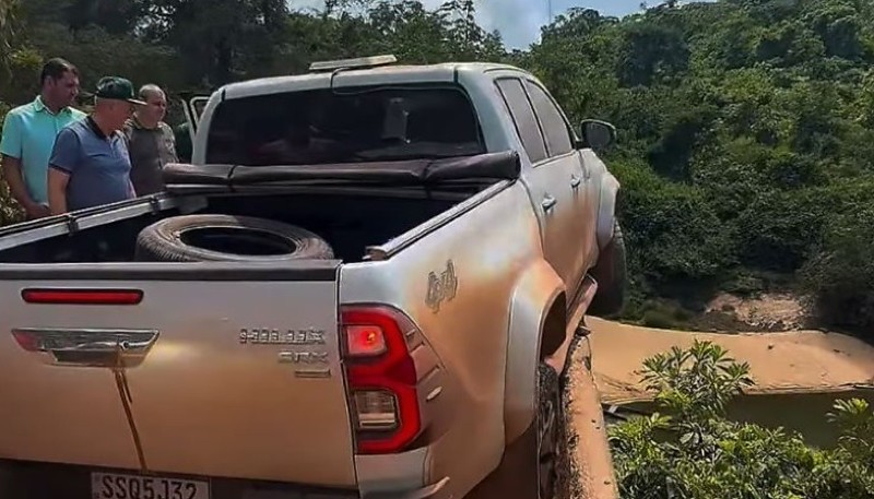 A equipe do vice-governador de Mato Grosso, Otaviano Pivetta (Republicanos), passou por um susto na quinta-feira (20), quando a caminhonete Hilux em que estava ficou pendurada e quase caiu de uma ponte estreita em uma estrada na zona rural de Matupá (684 km de Cuiabá).