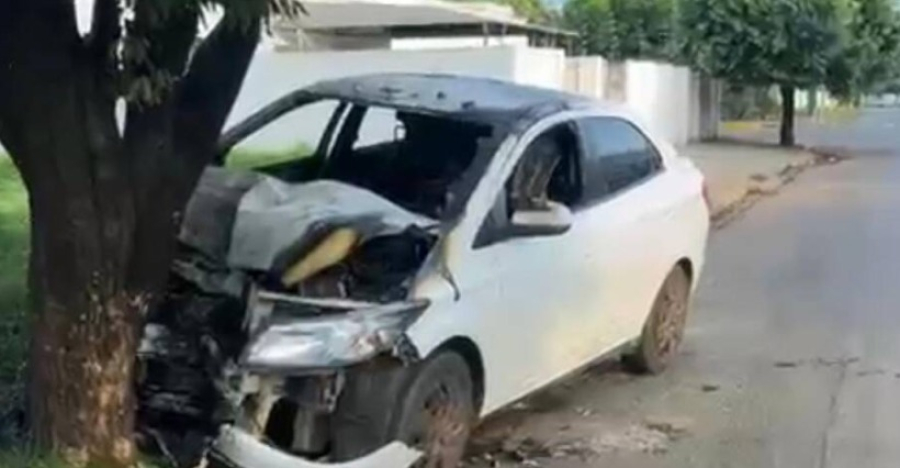 Carro pega fogo após colisão contra árvore em Lucas do Rio Verde