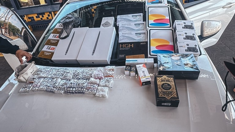 A Polícia Rodoviária Federal (PRF) apreendeu uma grande quantidade de anabolizantes, medicamentos para emagrecimento e eletrônicos durante fiscalização no km 211 da BR-364, em Rondonópolis (215 km de Cuiabá). Entre os itens estavam notebooks da marca Apple (MacBook) acondicionados em sacolas do Shopping China, no Paraguai, frascos de perfume e diversos produtos escondidos em malas, bolsas, nécessaires e até dentro de calçados. Parte dos eletrônicos excedia o limite permitido pela cota de importação, configurando descaminho.