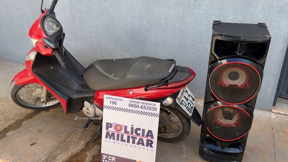 Durante a abordagem, os policiais encontraram o suspeito em posse da motocicleta furtada. Em uma residência, também foi localizado um aparelho de som que havia sido levado do imóvel no bairro Colinas.