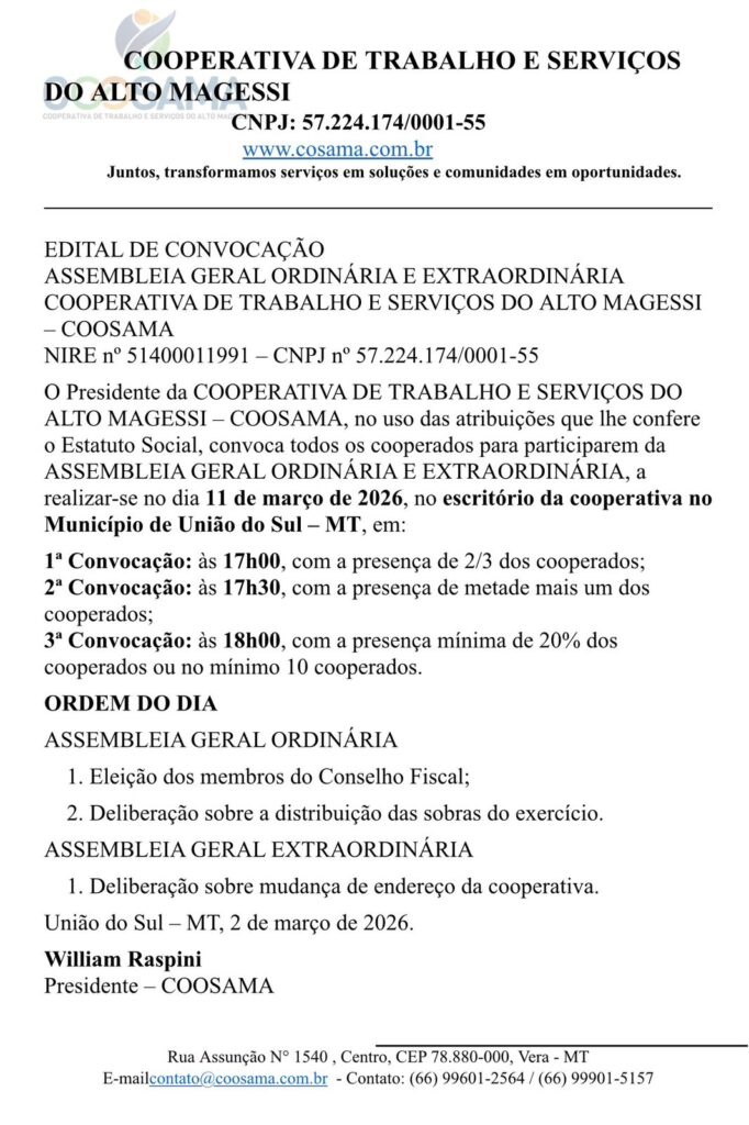 A Cooperativa de Trabalho e Serviços do Alto Magessi – COOSAMA publicou edital de convocação para a realização da Assembleia Geral Ordinária e Extraordinária, destinada aos cooperados da entidade. A reunião está marcada para o dia 11 de março de 2026, no escritório da cooperativa no município de União do Sul (MT).