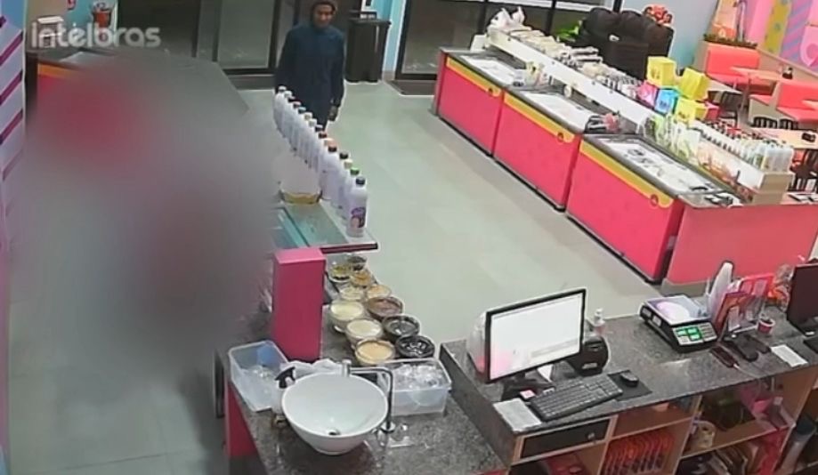 Nas imagens, o suspeito aparece vestindo um agasalho preto e um capacete. Ele se aproxima do balcão de forma calma, iniciando uma breve conversa com a funcionária, simulando um atendimento comum. Pouco depois, aproveita um momento de distração da vítima, anuncia o assalto e vai diretamente ao caixa, de onde retira uma quantia em dinheiro.
