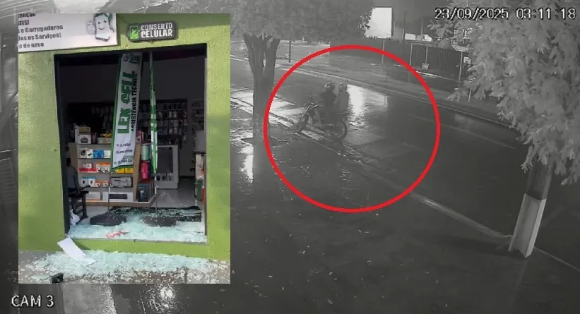 As câmeras de segurança registraram toda a ação. As imagens mostram os suspeitos tentando forçar a porta, mas sem sucesso. Minutos depois, retornaram com uma lajota de concreto, que foi utilizada para quebrar o blindex e facilitar a entrada na loja.