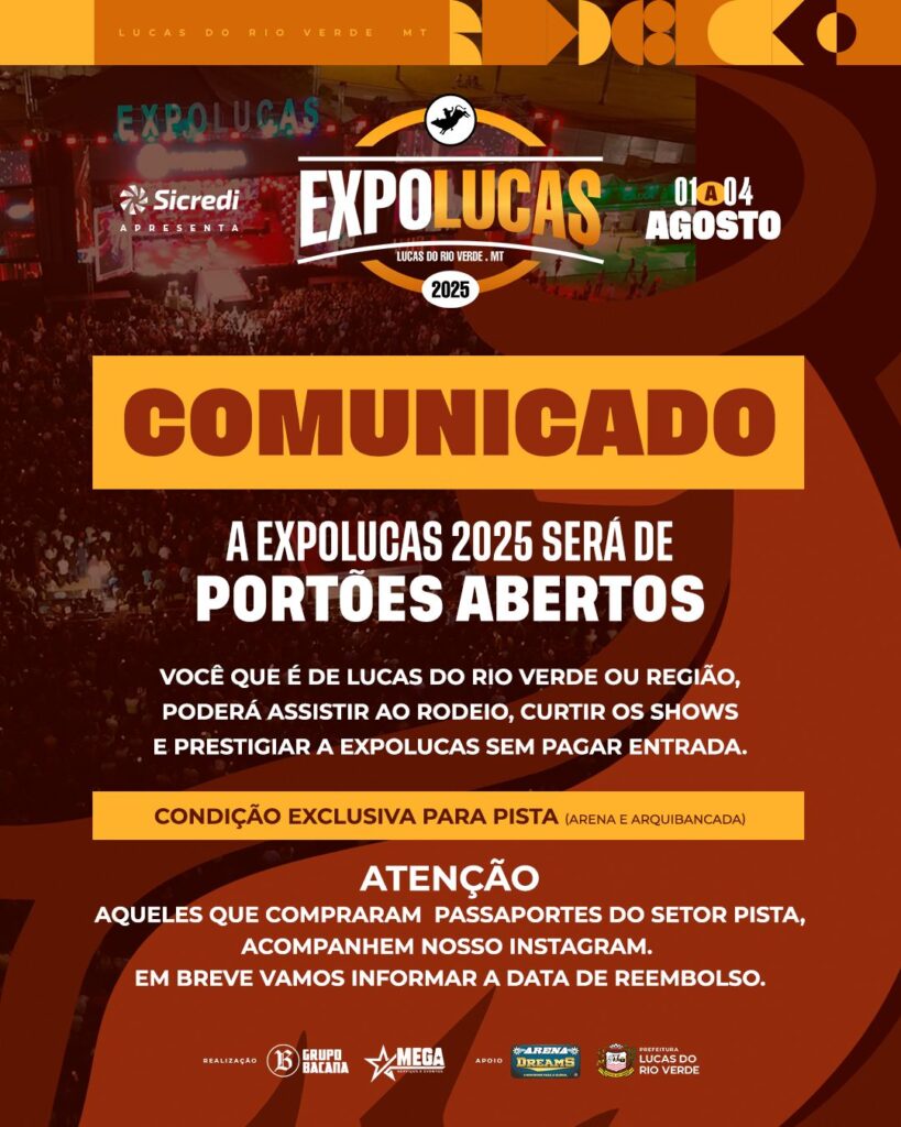 A organização informa que aqueles que já adquiriram o passaporte do setor pista devem ficar atentos às redes sociais oficiais do evento. Em breve será divulgada a data para solicitação de reembolso. Todas as informações serão publicadas no Instagram oficial da Expolucas.