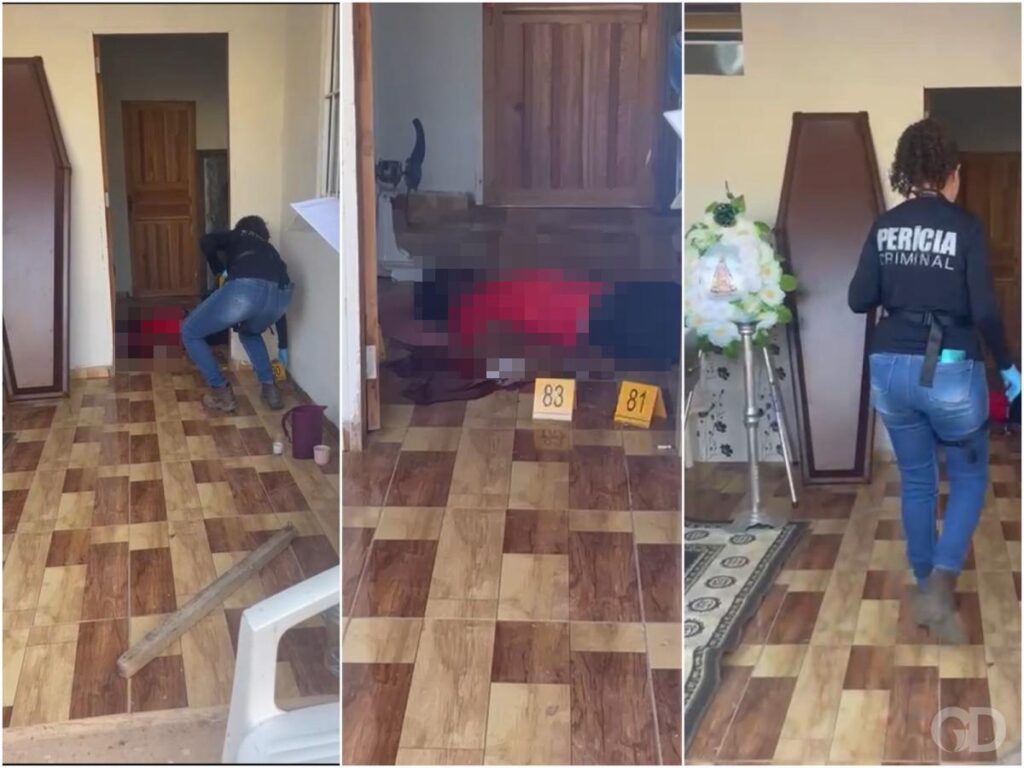 Nas imagens, é possível ver o caixão de Alice na sala. No cômodo ao lado, Rikelme está caído no solo. Vítima foi atingida por tiros na cabeça e ainda pegou uma faca para tentar se defender. A arma estava próximo do corpo, coberta por sangue.