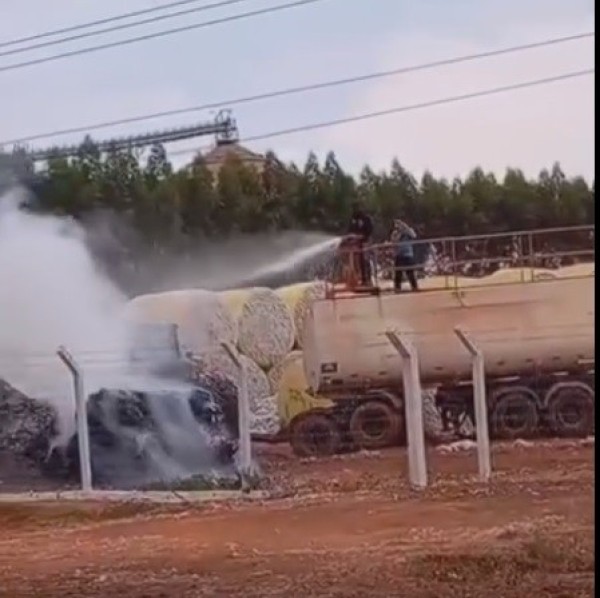 Um incêndio atingiu uma algodoeira na tarde desta terça-feira (9), em Marcelândia, após faíscas caírem sobre fardos de algodão estocados no local.