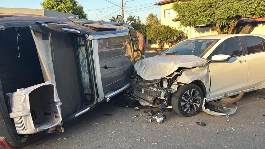 A batida envolveu um Chevrolet Onix e uma Fiat Toro. Com o impacto, a pick-up tombou e o Onix teve a parte frontal completamente destruída.