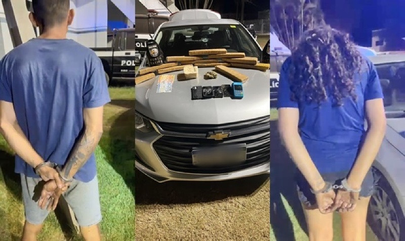 Na vistoria do veículo, foram encontradas porções de maconha e um tablete de pasta base de cocaína. No porta-malas, os agentes localizaram outros 11 tabletes de maconha, totalizando 12 tabletes de entorpecentes.
