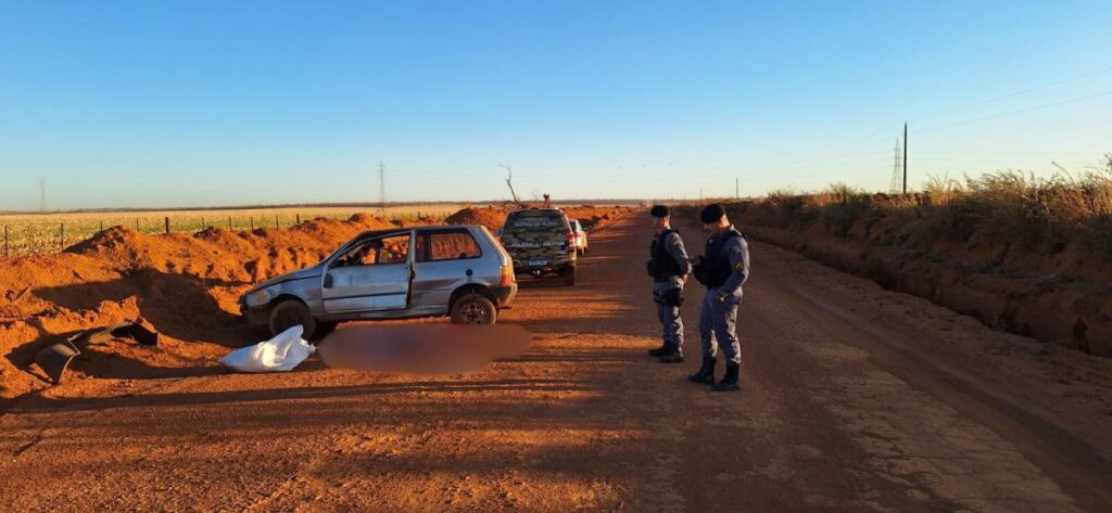 No local, a vítima foi encontrada do lado de fora do carro, aparentemente arremessada após bater contra o barranco, na estrada sem pavimentação.