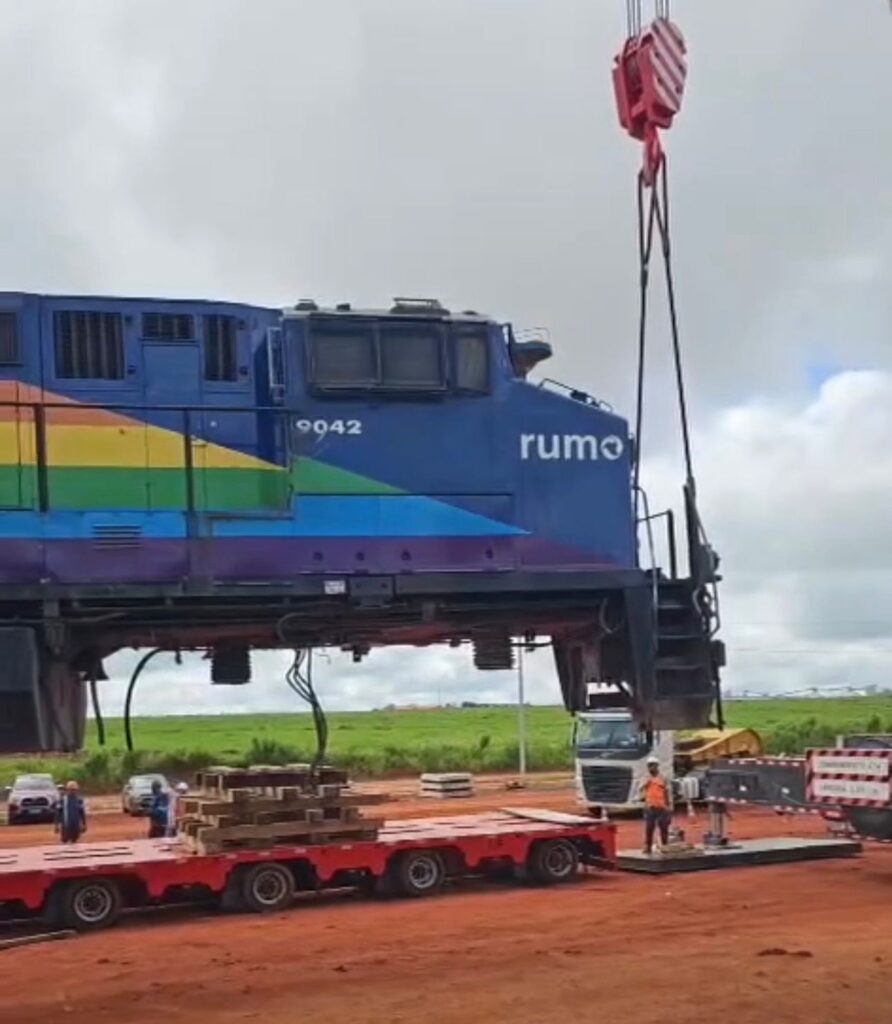 A locomotiva deixou Rondonópolis com destino ao pátio de Dom Aquino/Primavera do Leste, sendo transportada por uma carreta prancha. O deslocamento faz parte do avanço das obras da Ferrovia de Mato Grosso (FMT), já que o equipamento será utilizado nos trilhos em construção a partir de Rondonópolis.