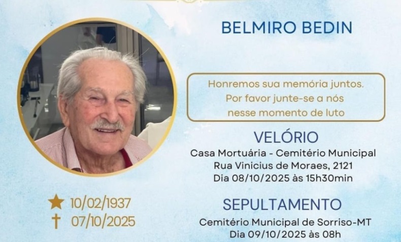 Faleceu aos 87 anos o empresário e produtor rural Belmiro Bedin, figura pioneira na história de Sorriso. Ele foi o proprietário do primeiro açougue da cidade, localizado na Avenida Natalino João Brescansin, e, desde sua chegada à região, desempenhou papel importante no desenvolvimento local, deixando contribuições marcantes para a comunidade.