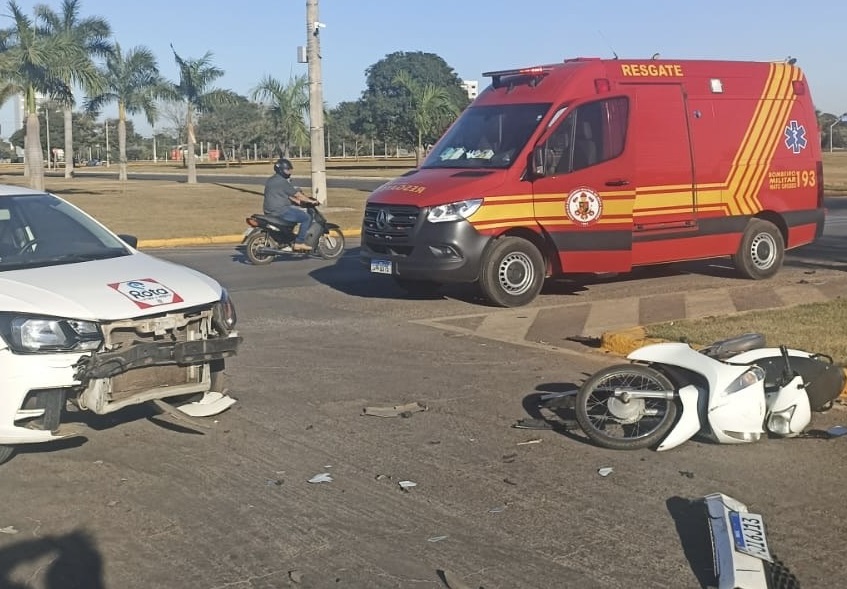 Uma motociclista ficou ferida na manhã desta quarta-feira (9) após se envolver em um acidente de trânsito na rotatória da Prefeitura, em Lucas do Rio Verde. A colisão entre um carro e uma motocicleta mobilizou o Corpo de Bombeiros Militar, que atendeu a ocorrência por meio da 13ª Companhia Independente.