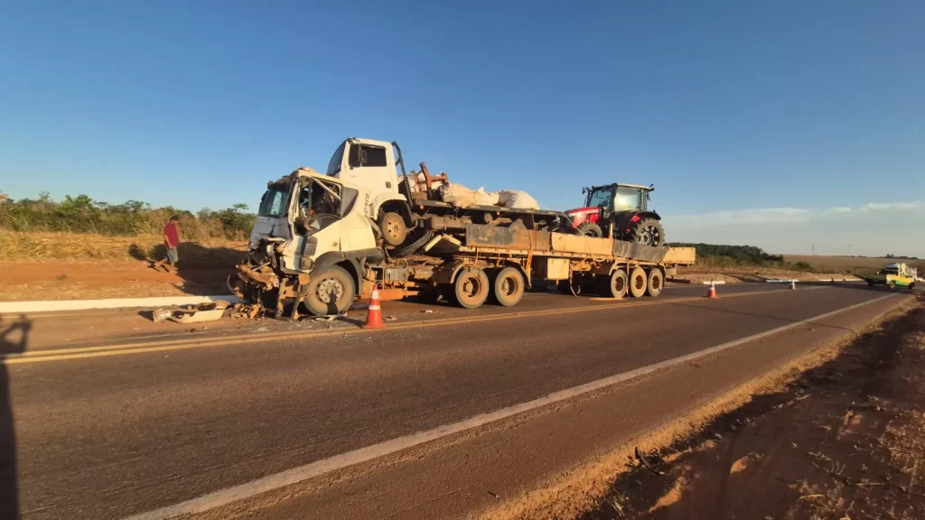 Com o impacto, a cabine do caminhão ficou completamente destruída. O veículo transportava outro caminhão, que foi projetado para frente no momento da batida.