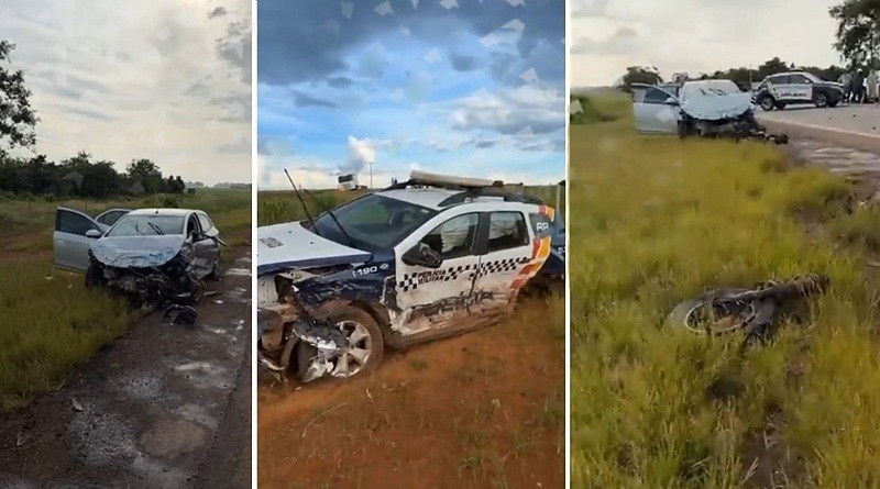 Com a força do impacto, o automóvel teve a parte frontal completamente destruída, com peças espalhadas pela pista e danos severos no motor. A viatura da Polícia Militar também sofreu avarias significativas. Apesar da violência da colisão, os policiais que ocupavam o veículo oficial não sofreram ferimentos.