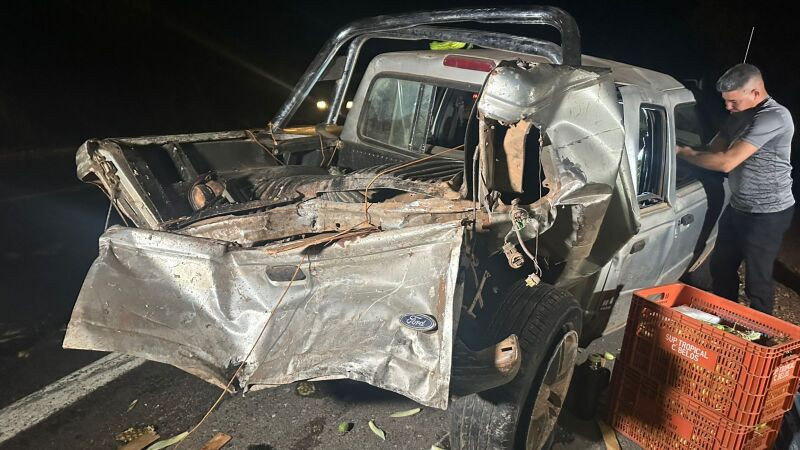 Com o impacto, a frente do carro foi completamente destruída. Parte da carga de frutas que estavam na carroceria da caminhonete foram espalhadas pela rodovia.