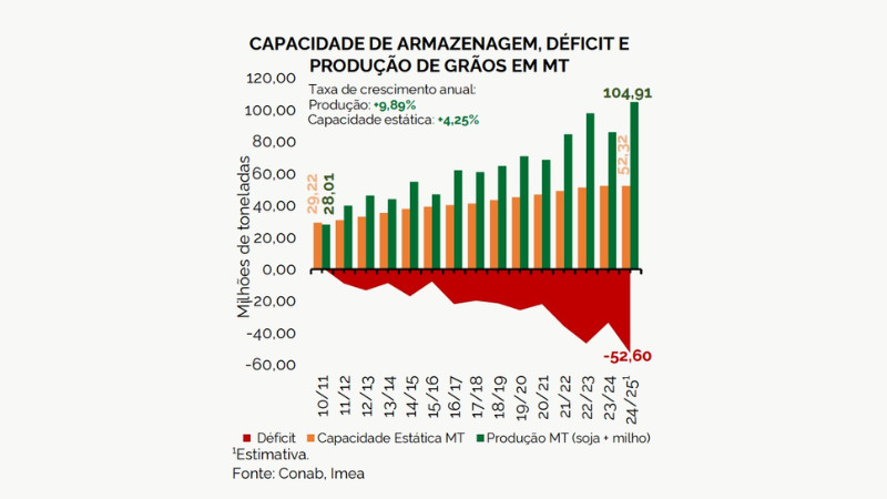 A defasagem entre produção e infraestrutura se arrasta há mais de uma década e vem se agravando. Dados da Companhia Nacional de Abastecimento (Conab) e do Imea indicam que, desde 2010/11, a produção de grãos no Estado cresceu, em média, 9,89% ao ano, enquanto a capacidade de armazenamento avançou apenas 4,25% ao ano.