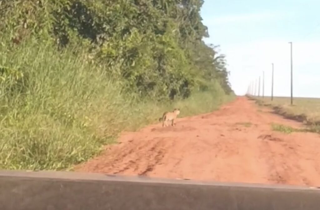 Desta vez, a onça foi observada caminhando tranquilamente pela estrada que margeia a lavoura, em plena luz do dia. As imagens chamaram a atenção pela proximidade do animal com a área de produção agrícola, reforçando a presença frequente da fauna silvestre na região.
