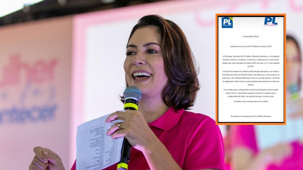 “A Presidente Nacional do PL Mulher, Michelle Bolsonaro, e a Presidente Estadual, Gislaine Yamashita, comunicam o adiamento do evento do PL Mulher que seria realizado em Sorriso (MT) nos dias 12 e 13 de setembro de 2025.