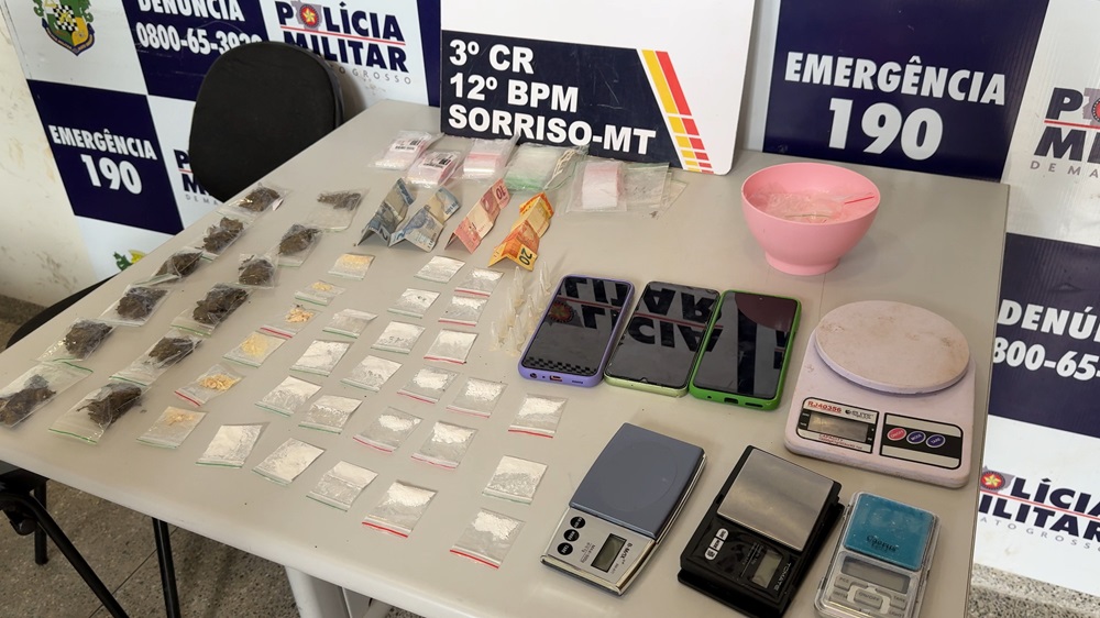 Com autorização do morador, os militares realizaram buscas no interior do imóvel e encontraram diversas porções de maconha embaladas em sacos do tipo zip lock, além de uma balança de precisão e dinheiro trocado indícios característicos da prática do tráfico de drogas.