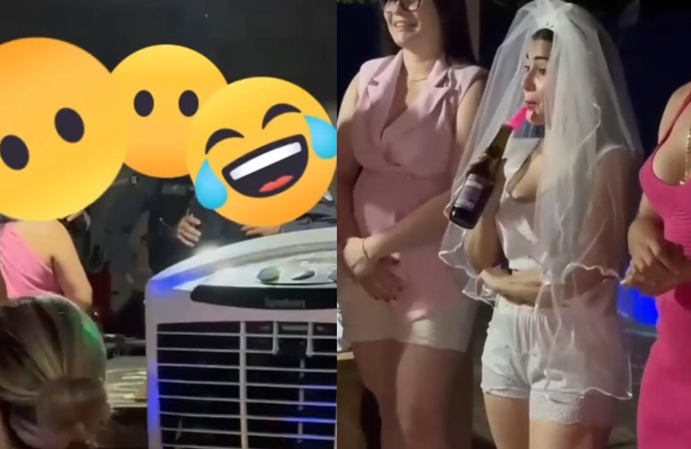 Eles bateram palmas, mas como ninguém apareceu, caminharam até os fundos da residência. Lá, encontraram as mulheres fantasiadas e a noiva de lingerie. As convidadas chegaram a filmar a cena, pensando se tratar de uma surpresa.