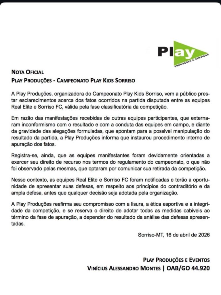 Em razão dos recentes acontecimentos envolvendo a competição Copa Play Kids, especialmente quanto a questionamentos relacionados à condução de partidas e a possíveis situações que possam comprometer a lisura esportiva, as instituições entendem ser seu dever se posicionar com responsabilidade, transparência e respeito aos atletas, familiares e à comunidade esportiva.