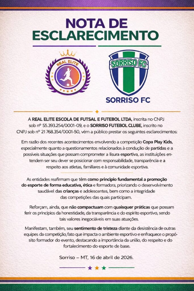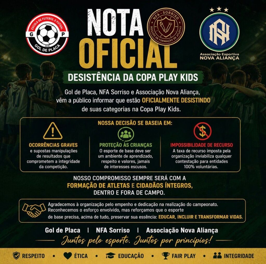 Três importantes projetos esportivos de base de Sorriso anunciaram oficialmente a desistência de participação na Copa Play Kids. A decisão foi divulgada por meio de uma nota conjunta assinada pela Escola de Futebol Gol de Placa, NFA Sorriso (Núcleo de Formação de Atletas) e a Associação Esportiva Nova Aliança.