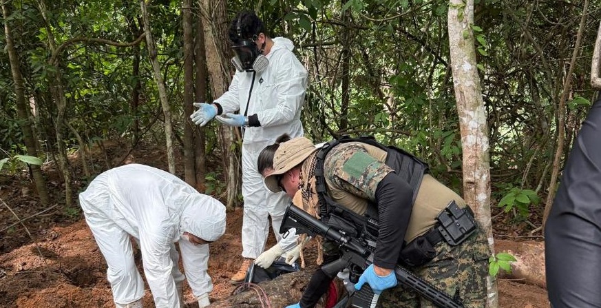No ponto indicado, as equipes descobriram sinais de enterramentos clandestinos e localizaram dois corpos que ainda aguardam identificação.
