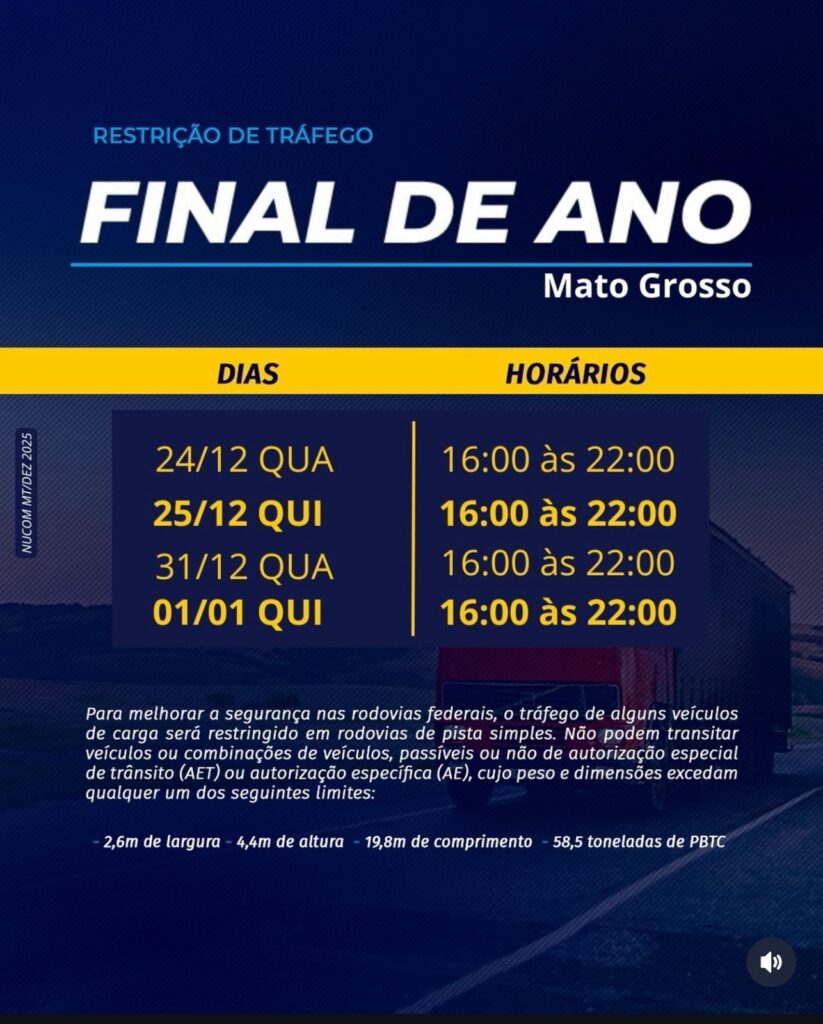 A Polícia Rodoviária Federal (PRF) divulgou o calendário de restrição de tráfego para veículos de carga nas rodovias federais que cortam Mato Grosso durante os feriados de Natal e Ano Novo. A medida tem como objetivo reforçar a segurança viária em períodos de grande fluxo de veículos, especialmente em trechos de pista simples.