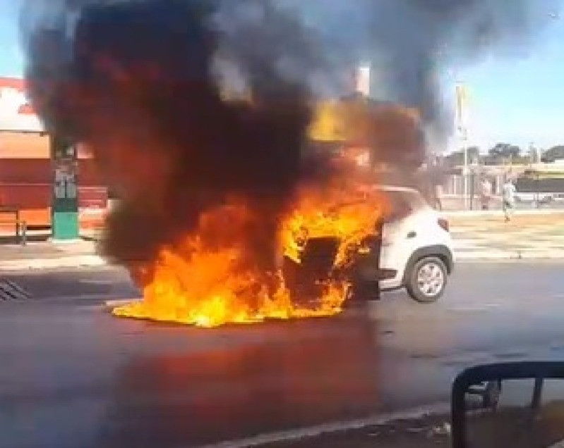 Um Renault Kwid branco ficou completamente destruído após pegar fogo, depois de bater na traseira de uma caminhonete, na Avenida Fernando Corrêa da Costa, em Cuiabá, na manhã desta terça-feira (12). A suspeita é que o incêndio tenha começado na bateria do veículo após a batida. As imagens do momento das chamas viralizaram nas redes sociais.
