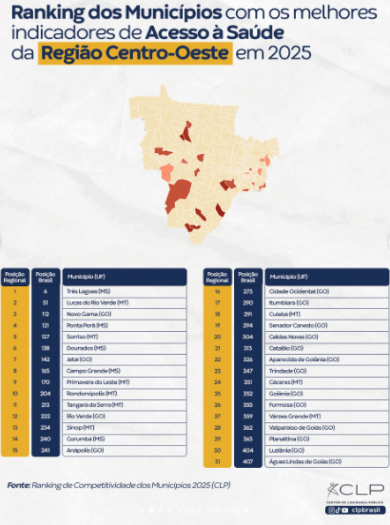 Sorriso mais uma vez se destaca no cenário nacional pelas políticas públicas voltadas à saúde. No Ranking de Competitividade dos Municípios 2025, elaborado pelo Centro de Liderança Pública (CLP), o município reafirma seu protagonismo ao figurar entre os 10 melhores do Centro-Oeste no indicador de Acesso à Saúde, um reconhecimento que traduz o cuidado, o planejamento e o compromisso contínuo com uma gestão moderna, tecnológica e humanizada.
