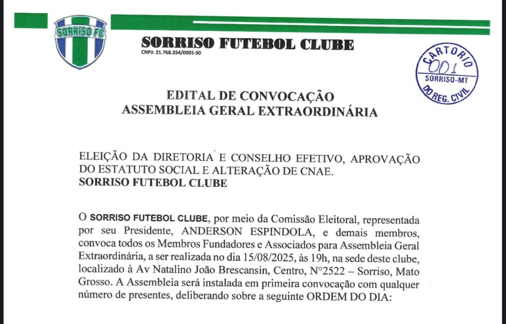 O Sorriso Futebol Clube, por meio da Comissão Eleitoral, anunciou a convocação oficial de seus membros fundadores e associados para uma Assembleia Geral Extraordinária, que acontecerá no próximo dia 15 de agosto de 2025, às 19h, na sede do clube, localizada na Avenida Natalino João Brescansin, nº 2522, Centro, em Sorriso (MT).