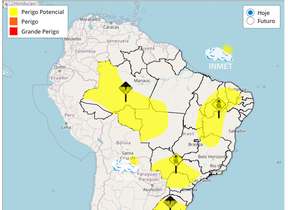 O Instituto Nacional de Meteorologia (Inmet) emitiu um aviso de perigo potencial válido a partir das 9h20 desta sexta-feira (19) para diversas cidades de Mato Grosso, incluindo Sorriso e Sinop.