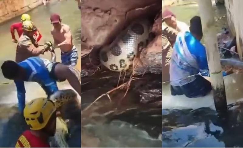 O Corpo de Bombeiros resgatou, na manhã deste domingo (12), uma sucuri de cinco metros e meio em Rio Quente (GO). O animal estava escondido sob uma estrutura de concreto próxima à área de banho de um hotel na Esplanada Thermas Park.