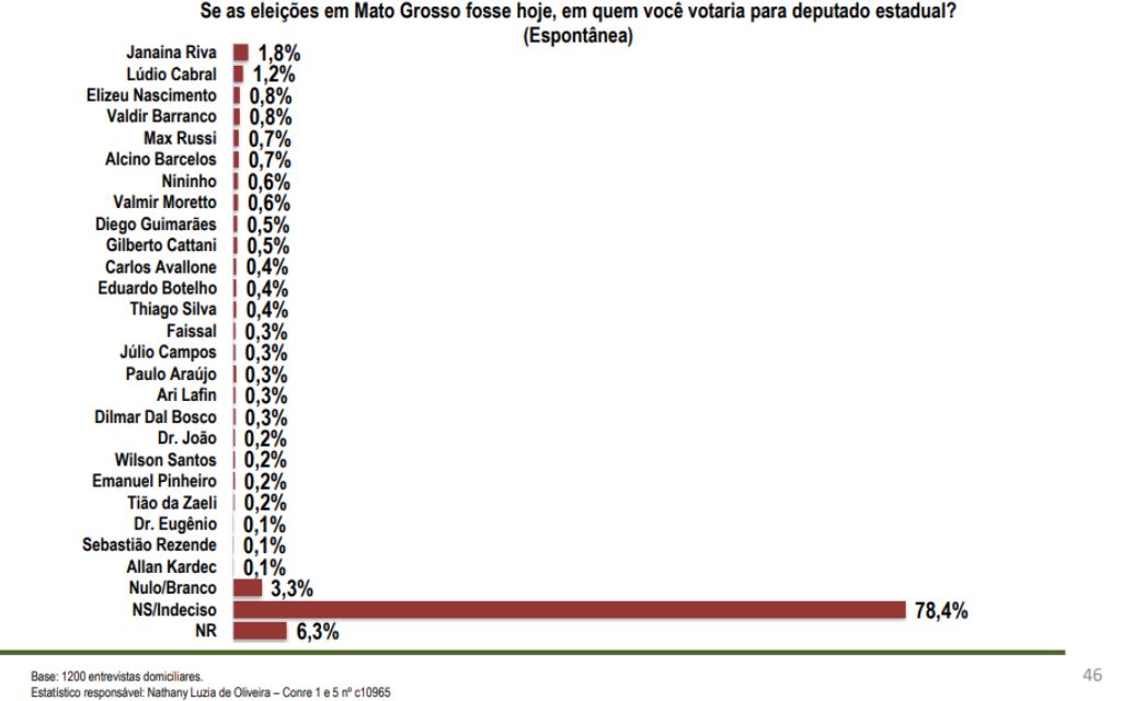 No cenário espontâneo, quando não são apresentados nomes aos entrevistados, a liderança ficou com Janaina Riva (1,8%), seguida por Lúdio Cabral (1,2%), Elizeu Nascimento (0,8%), Valdir Barranco e Max Russi (ambos com 0,7%). Na sequência, aparecem Alcino Barcelos (0,7%), Nininho (0,6%), Valmir Moretto (0,6%), Diego Guimarães (0,5%) e Gilberto Cattani (0,5%). Já Ari Lafin e Dilmar Dal Bosco surgem com 0,3% cada.