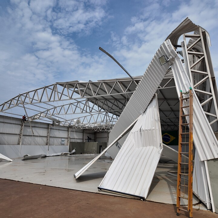 Um forte vendaval atingiu o município de Querência (MT) por volta das 23h desta terça-feira (14), causando grandes estragos no complexo da Cooperquer e também nas instalações do Aeroporto Municipal. As rajadas de vento arrancaram telhas, retorceram estruturas metálicas e deixaram parte dos armazéns expostos à chuva. Placas de cobertura foram arremessadas a centenas de metros de distância, e equipamentos sofreram avarias. Felizmente, não há registro de feridos.