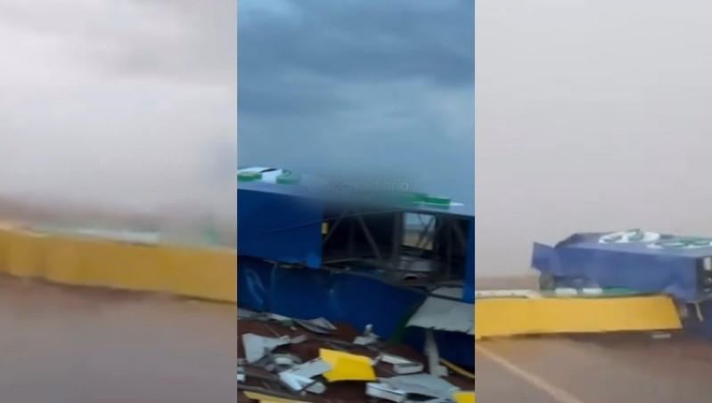 Um vídeo que circula nas redes sociais mostra o momento em que o portal que fina na entrada de Campos de Júlio (566 km de Cuiabá), às margens da BR-364, desabou durante um temporal, na tarde de domingo (31). Apesar do susto, não houve registro de feridos.
