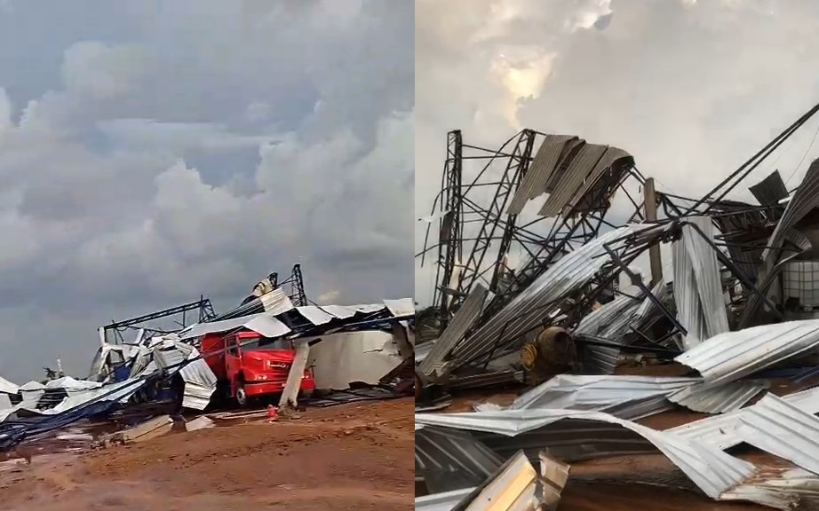 Imagens registradas após o ocorrido mostram a estrutura totalmente retorcida e materiais espalhados pelo chão. A força do vento também danificou equipamentos e parte da cobertura da propriedade.