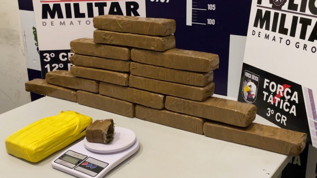 Com as informações, a PM localizou um barril azul enterrado em uma área de mata no bairro Rota do Sol. No interior, foram apreendidos aproximadamente 7,6 kg de maconha e skunk, além de uma balança de precisão.